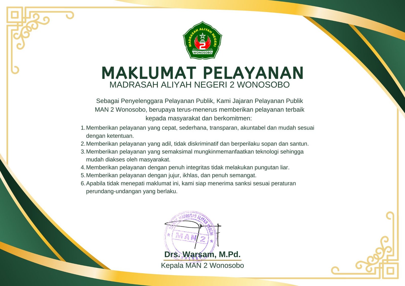 MAN 2 Wonosobo mengemban amanah untuk membawa peserta didik agar memiliki pengetahuan yang luas, cerdas, kreatif, terampil, disiplin, berakhlaq qur’ani dan menerapkan pembelajaran yang modern.