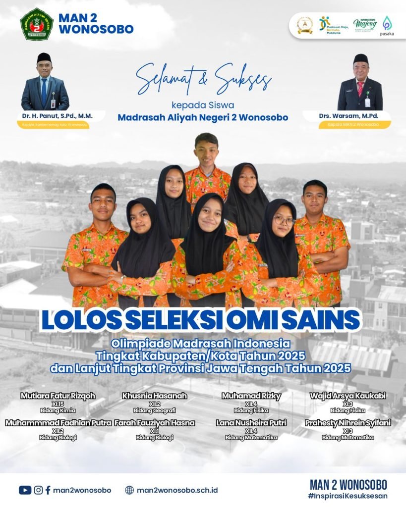 WONOSOBO — Madrasah Aliyah Negeri (MAN) 2 Wonosobo kembali mencatatkan prestasi gemilang dalam bidang akademik. Sebanyak delapan siswa dari madrasah ini berhasil lolos seleksi ketat Tingkat Kabupaten dan lolos Olimpiade Madrasah Indonesia (OMI) Bidang Sains Tingkat Provinsi Jawa Tengah. Kepastian itu di dapatkan setelah rilis hasil OMI Bidang Sains Tingkat Kabupaten Wonosobo keluar pada Kamis (18/9/2025).