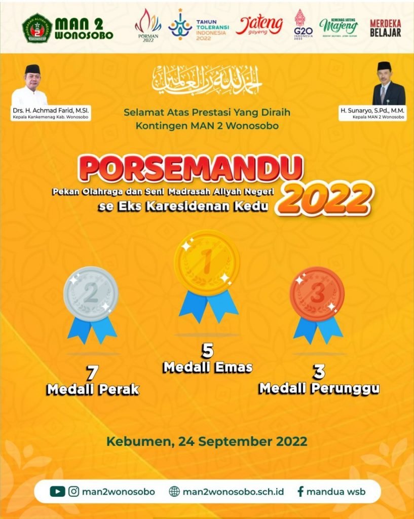 Wonosobo – MAN 2 Wonosobo seakan tak bosan mengukir prestasi, khususnya di bidang non akademik dan olahraga. MAN 2 Wonosobo berhasil memboyong 15 medali pada Pekan Olahraga dan Seni MAN se eks-Karesidenan Kedu atau yang sering disebut PORSEMANDU. Event ini merupakan perhelatan kompetisi olahraga dan seni antar MAN di eks Karesidenan Kedu yang meliputi kota Magelang, Kabupaten Magelang, Wonosobo, Temanggung, Purworejo dan Kebumen. Berlangsung selama satu hari yaitu 24 September 2022, event ini berlangsung di Kebumen yang berpusat di MAN 1 Kebumen.