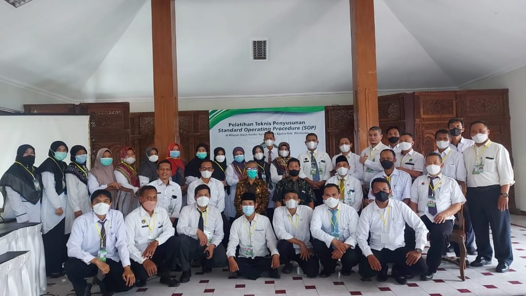 Wonosobo – Kementerian Agama Kabupaten Wonosobo menjadi tempat penyelenggaran Pelatihan di Wilayah Kerja (PDWK) Balai Diklat Kementerian Agama Semarang. Kegiatan tersebut dilaksanakan pada 7 – 12 Maret 2022 bertempat di Rumah Makan Wonoboga Wonosobo. Penyusunan Standard Operating Procedure (SOP) menjadi ini utama pelatihan tersebut. 35 peserta dari berbagai tempat tugas di lingkungan Kementerian Agama Kabupaten Wonosobo mengikuti kegiatan tersebut dengan antusias.